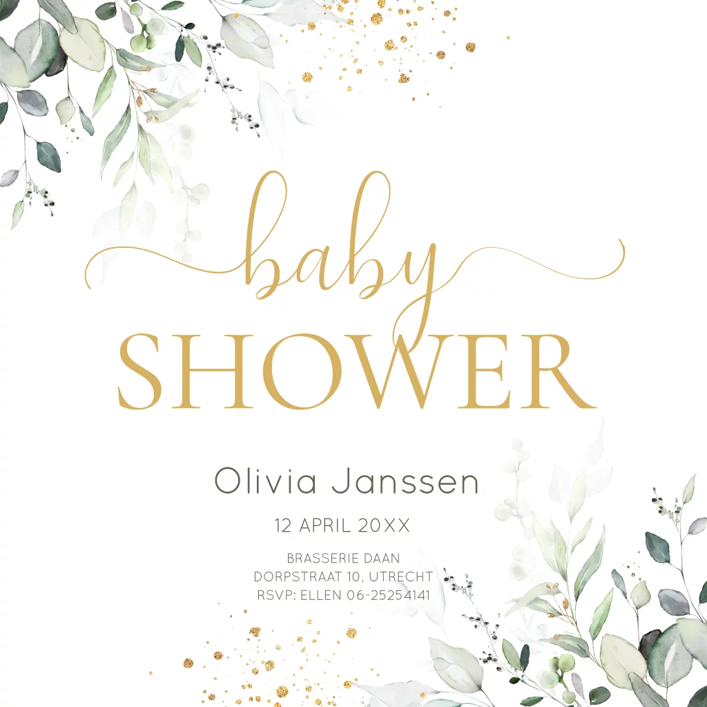 Babyshower uitnodiging botanisch met groene waterverf bladeren.