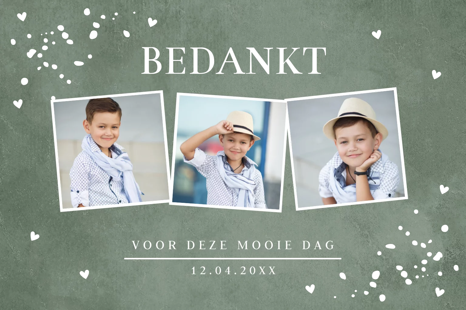 Bedankkaart communie groen fotocollage jongen goudfolie