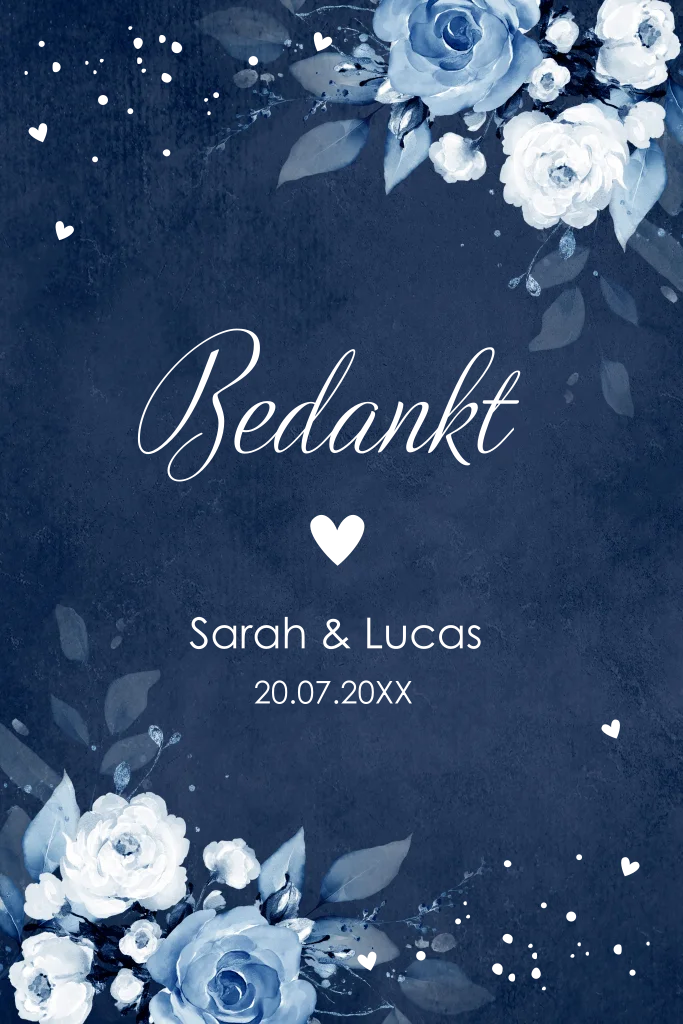 Bedankkaart huwelijk blauw bloemen goudfolie