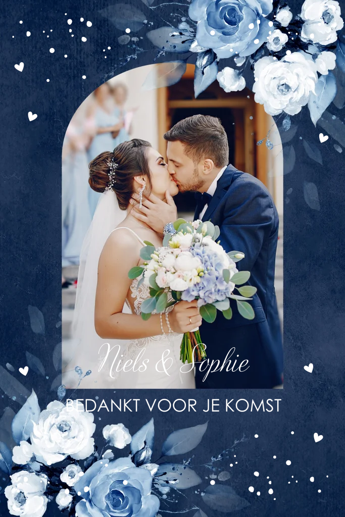 Bedankkaart huwelijk blauw met foto in boog vorm, bloemen en zilverfolie.