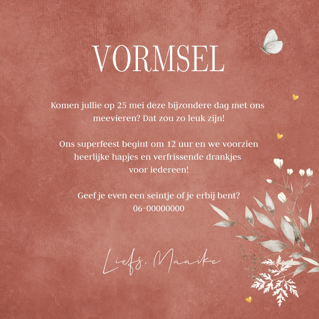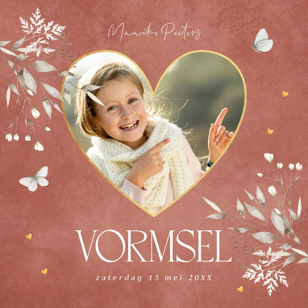 Uitnodiging vormsel meisje foto hartje bloemen vlinders