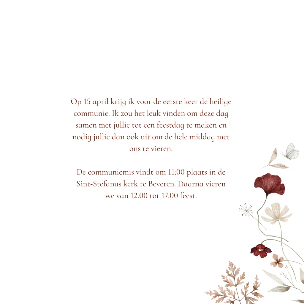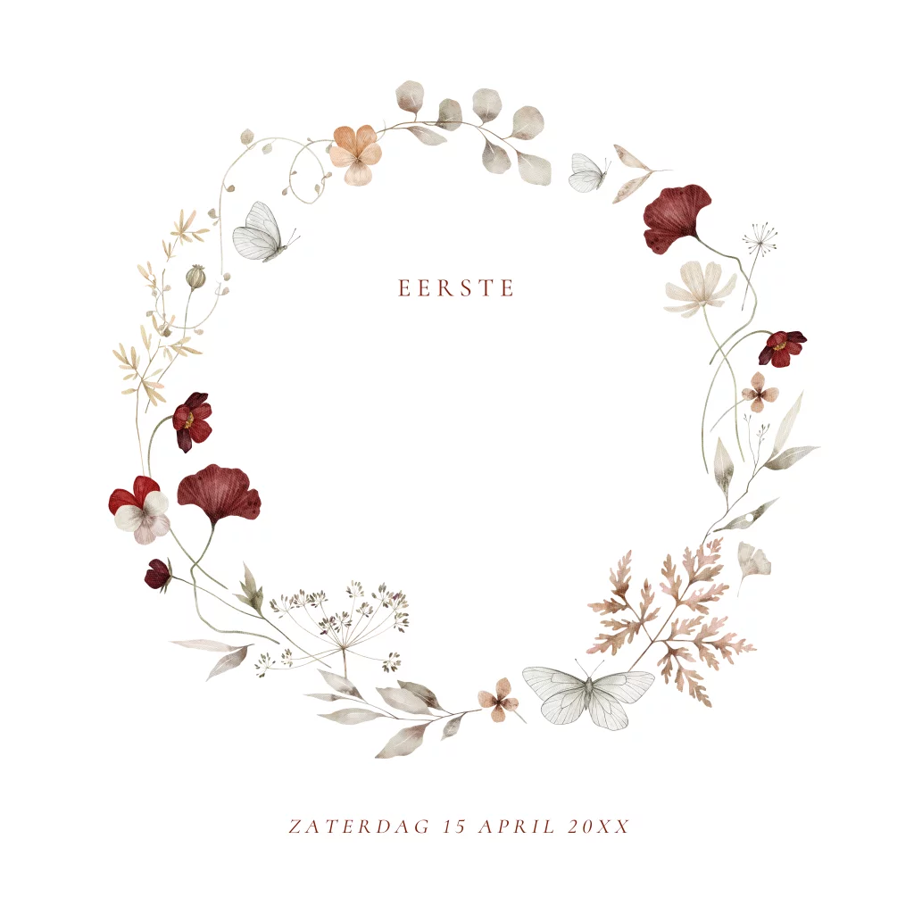Communiekaart uitnodiging wit voor een meisje met bloemenkrans rood beige. In de binnenkant is ruimte voor een foto.
