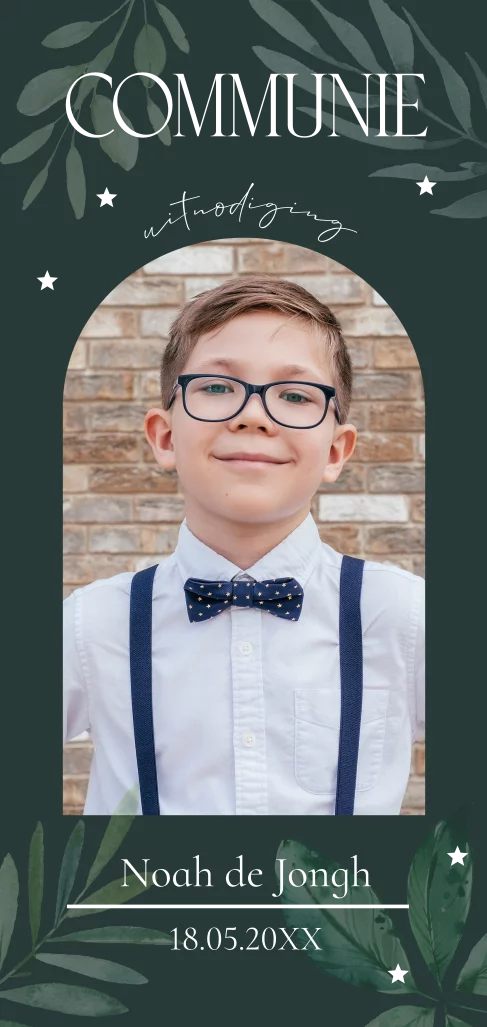 Communie uitnodiging jongen langwerpig groen botanisch foto goudfolie