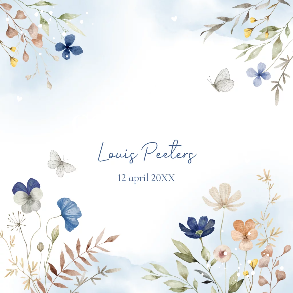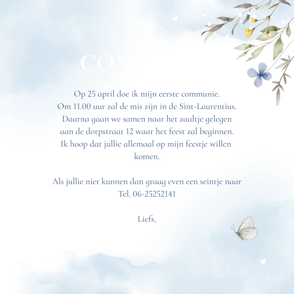 Communie uitnodiging voor een jongen met mooie veld bloemen blauw, watercolour, vlinders en goudfolie.