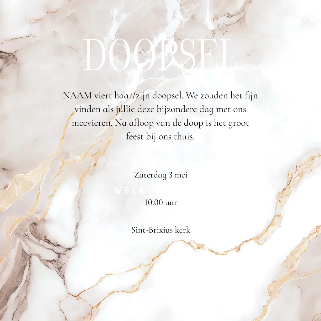 Doopkaart voor een jongen of meisje beige met marmerlook en goudfolie.