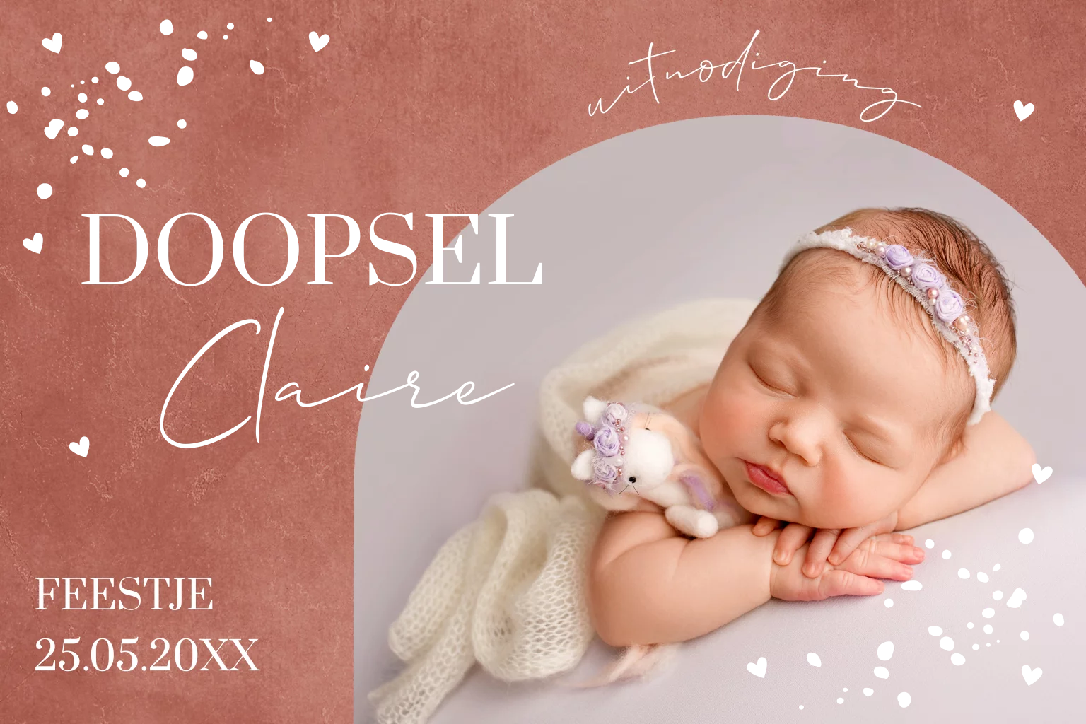 Doop uitnodiging doopkaart meisje foto boog terracotta goudfolie