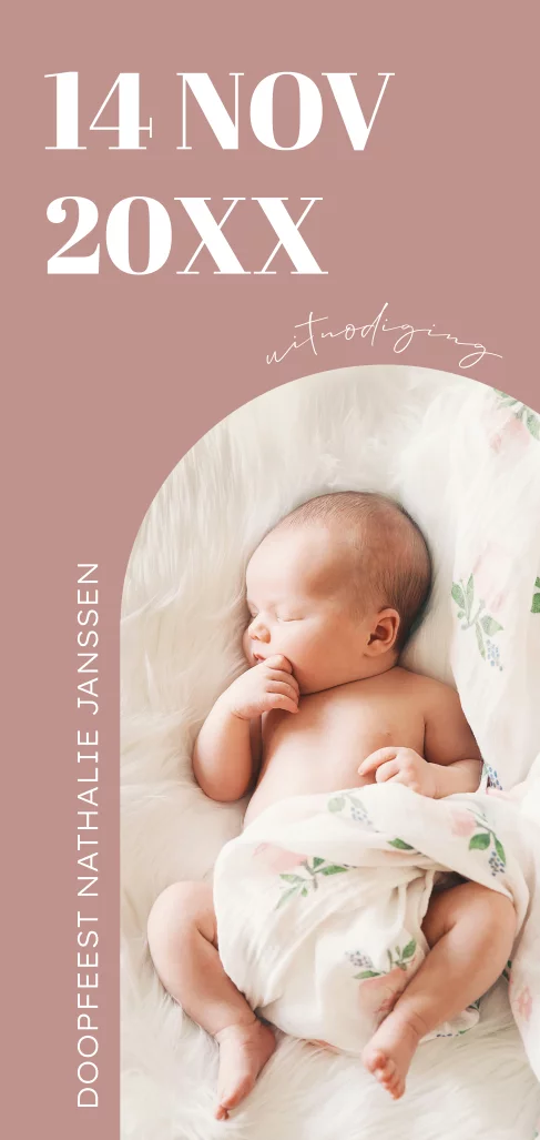 Doopkaart langwerpig voor een meisje met oudroze en foto in boog.