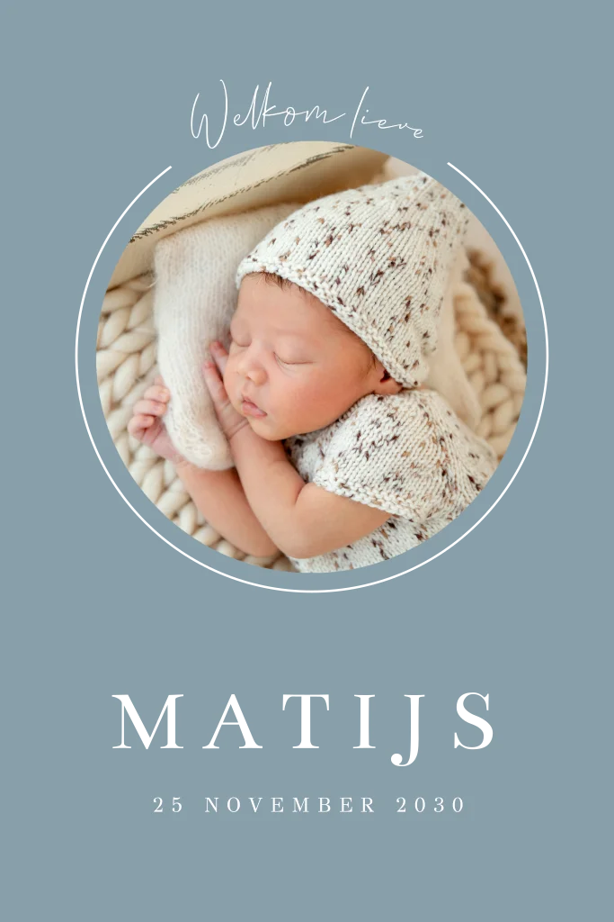 Geboortekaartje blauw voor een jongen met ronde foto en goudfolie.