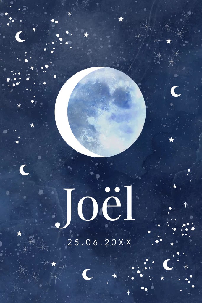 Geboortekaartje jongen blauw maan stand sterren goudfolie