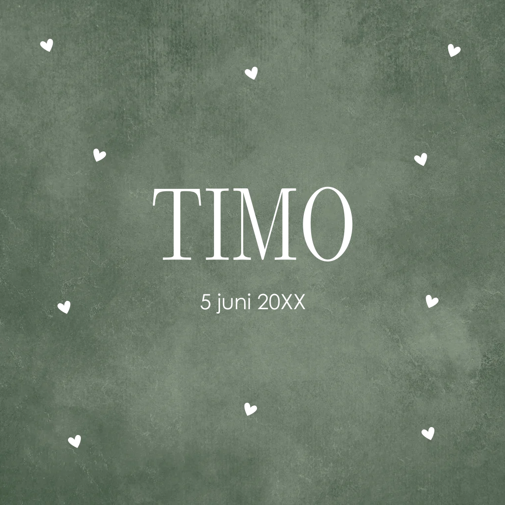 Geboortekaartje voor een jongen groen met hartjes en goudfolie.
