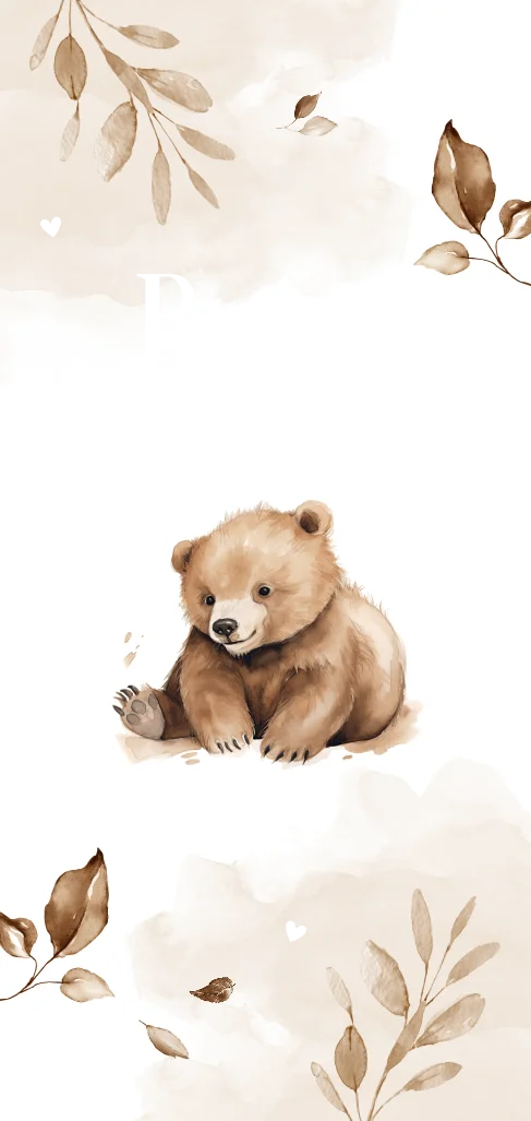 Geboortekaartje langwerpig beige voor jongen of meisje met lief beertje en hoogglans.
