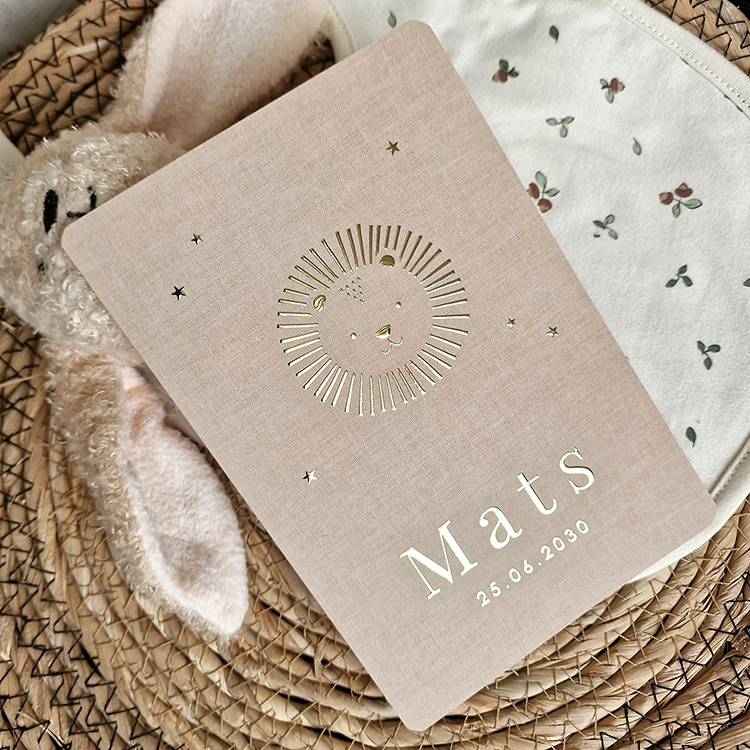 Hip geboortekaartje gender neutraal beige goud met leeuwtje, linnenlook en goudfolie. Dit mooie geboortekaartje past perfect bij het jungle thema.