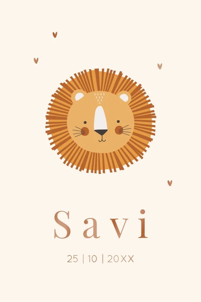 Hip geboortekaartje voor een jongen of meisje met leeuwtje, hartjes en hoogglans. Dit mooie geboortekaartje past perfect bij het jungle thema.