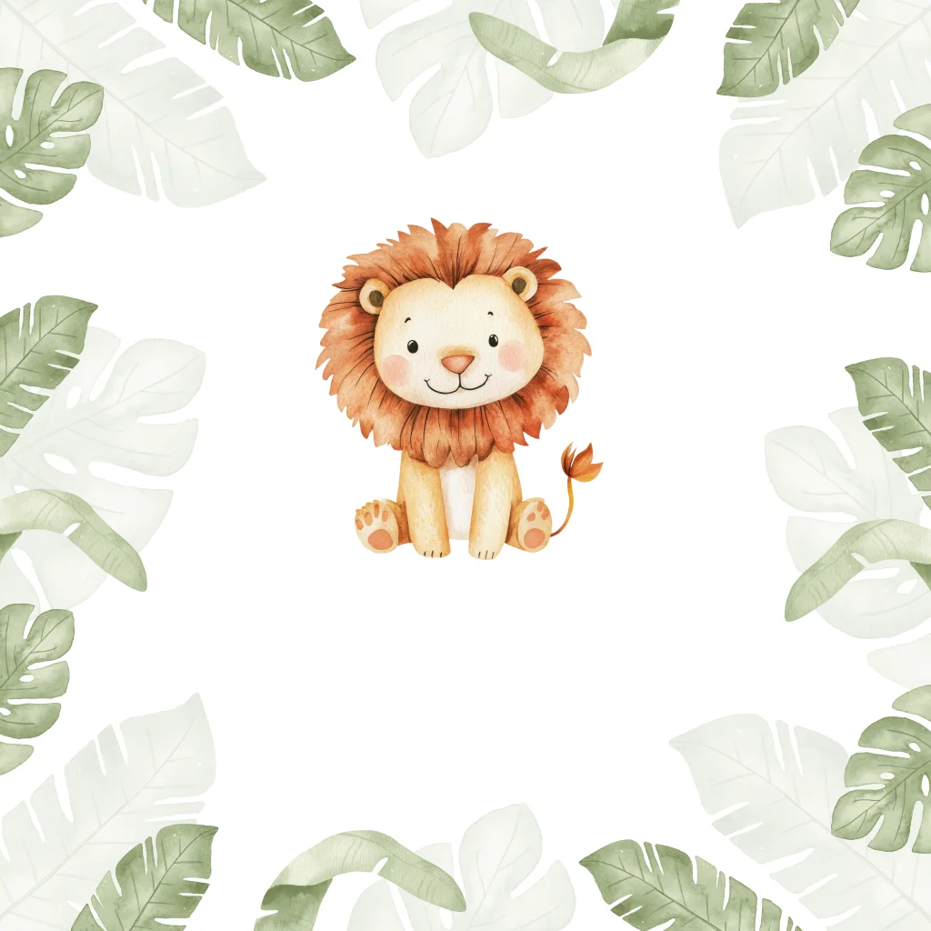 Hip geboortekaartje voor een jongen of meisje met leeuwtje, botanische groene bladeren en goudfolie. Perfect voor het jungle thema.