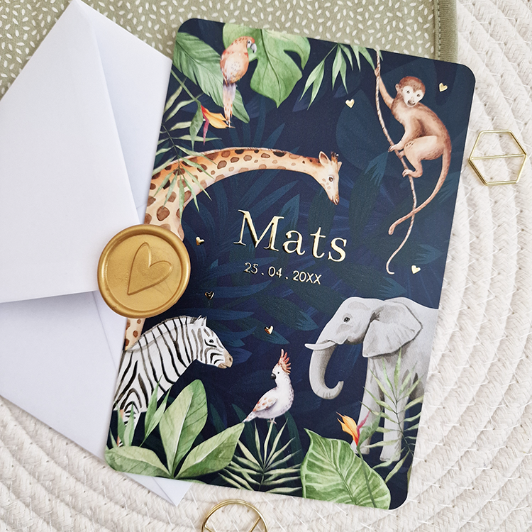 Geboortekaartje voor een jongen met jungle dieren en goudfolie. Kies voor dit super leuke geboortekaartje met giraffe, aapje, zebra, olifantje en vogels.