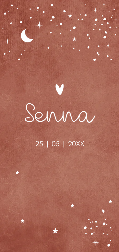 Geboortekaartje langwerpig roestbruin met goudfolie.
