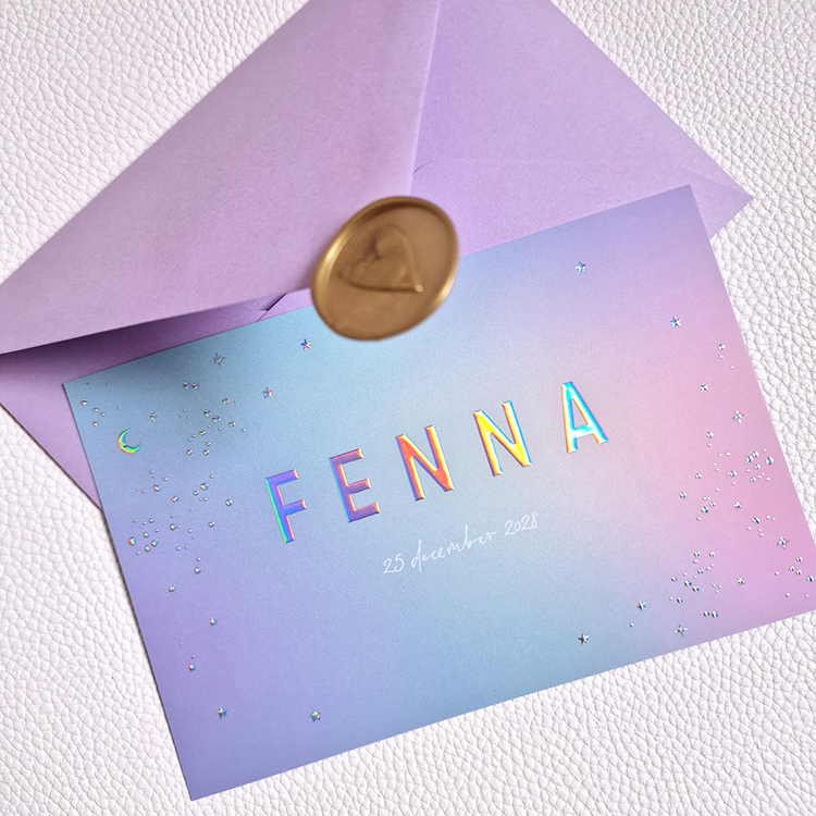 Trendy geboortekaartje voor een meisje met een dromerige holografische print lila roze. De regenboog folie maakt het extra bijzonder!