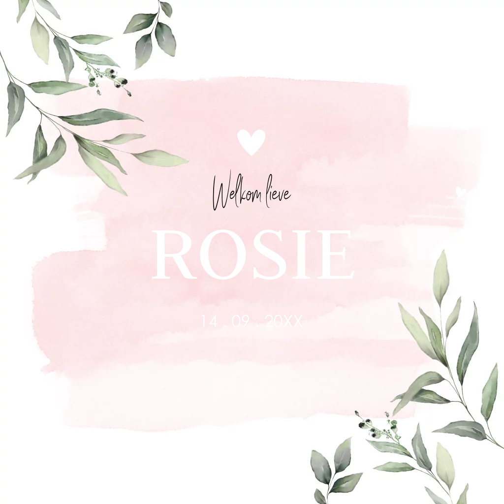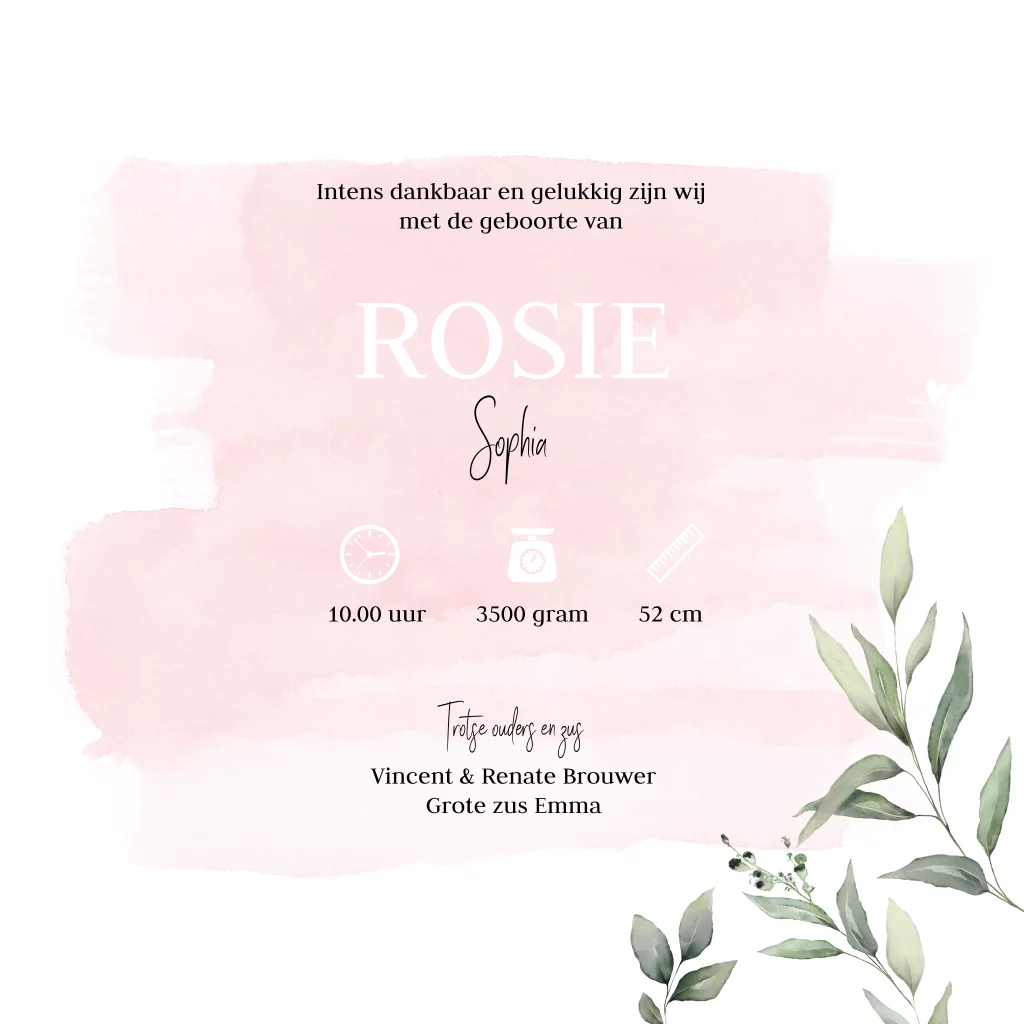 Geboortekaartje meisje roze waterverf bladeren botanisch goudfolie