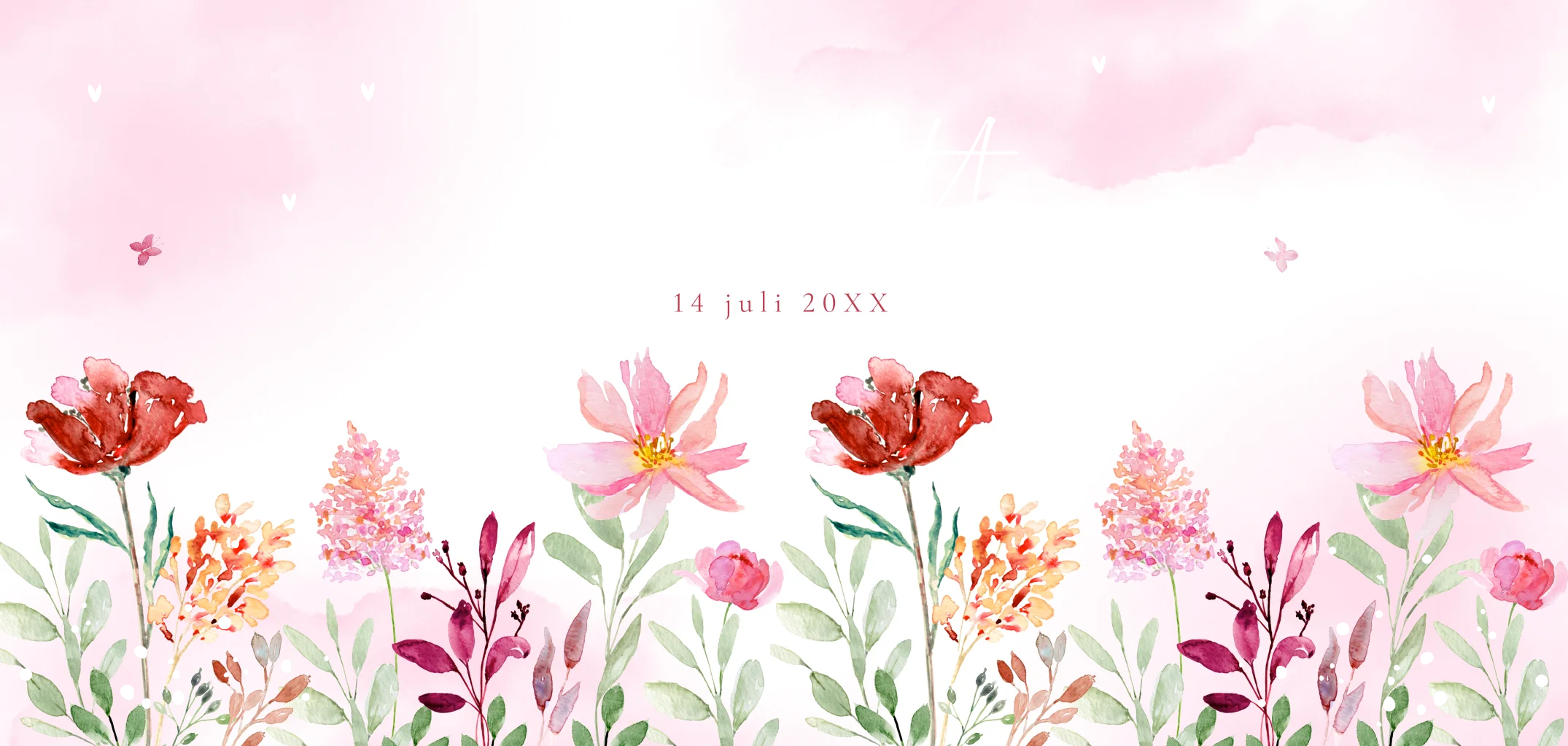 Geboortekaartje meisje langwerpig wit met waterverf bloemen. Kies voor dit prachtige geboortekaartje met roze bloemen en goudfolie.