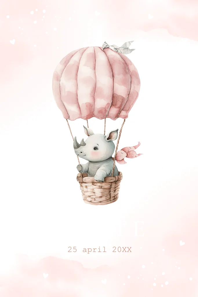 Geboortekaartje voor een meisje met neushoorn in luchtballon roze met goudfolie.