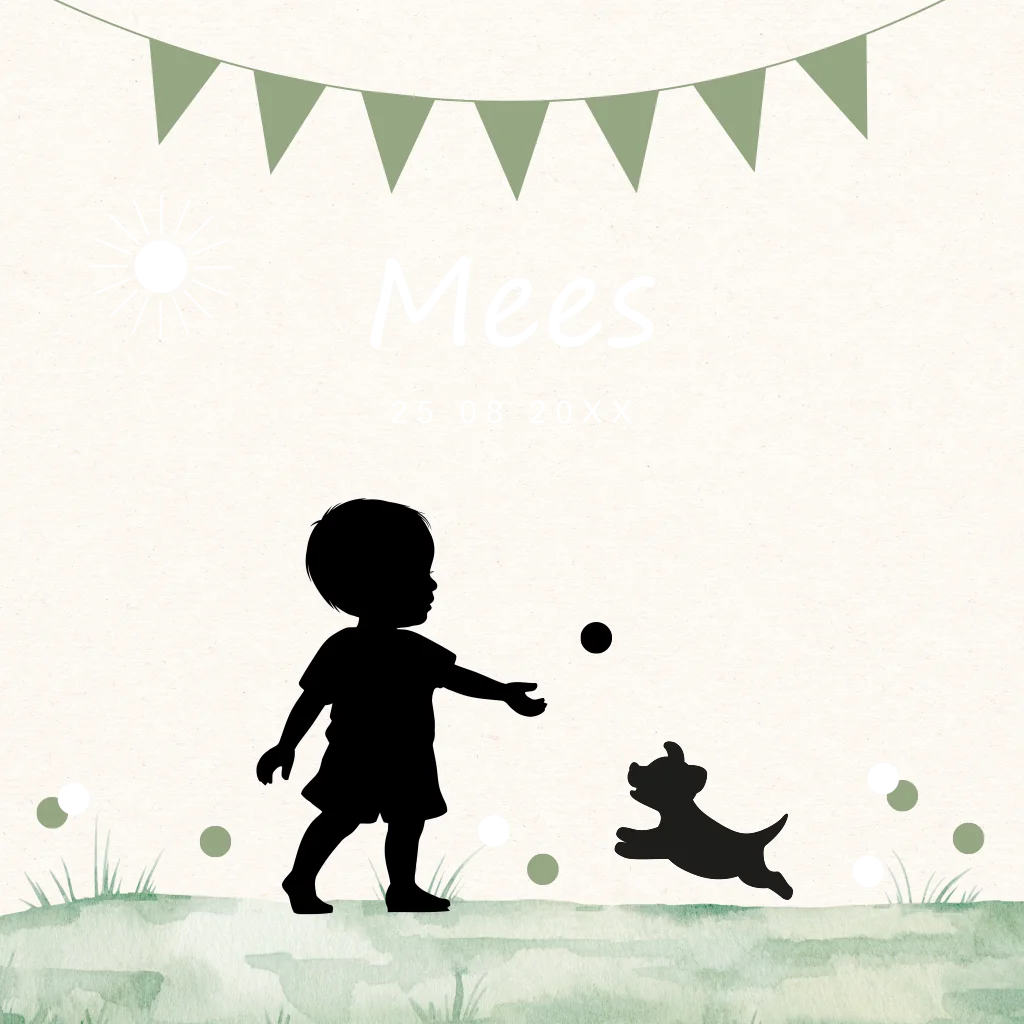 Geboortekaartje voor een jongen groen met silhouet jongen, hondje en goudfolie.