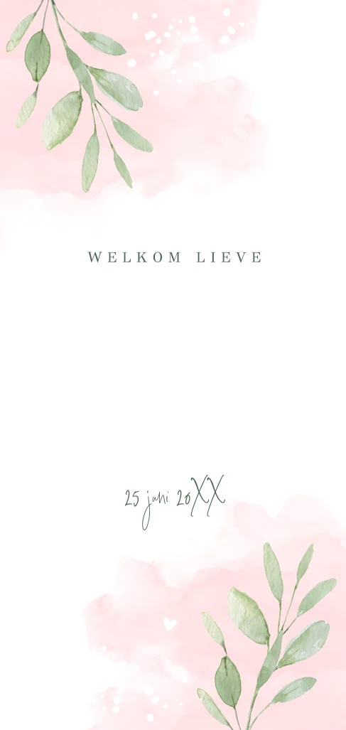Mooi origineel geboortekaartje voor een tweeling meisjes botanisch met roze watercolour, groene bladeren, hartjes en goudfolie.