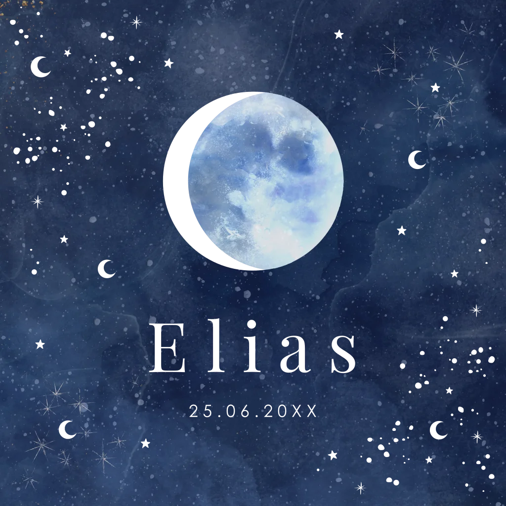 Geboortekaartje voor een jongen blauw met maan, sterren en goudfolie.