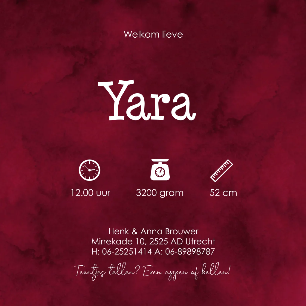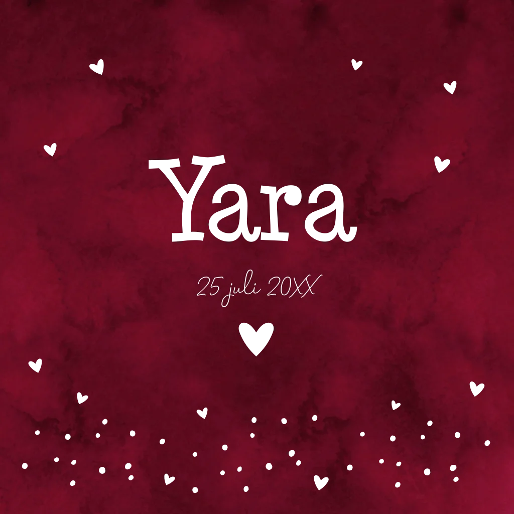 Geboortekaartje voor een meisje rood met hartjes en goudfolie.