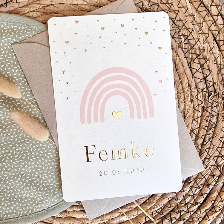 Geboortekaartje creme wit voor een meisje met roze regenboog, hartjes en goudfolie.