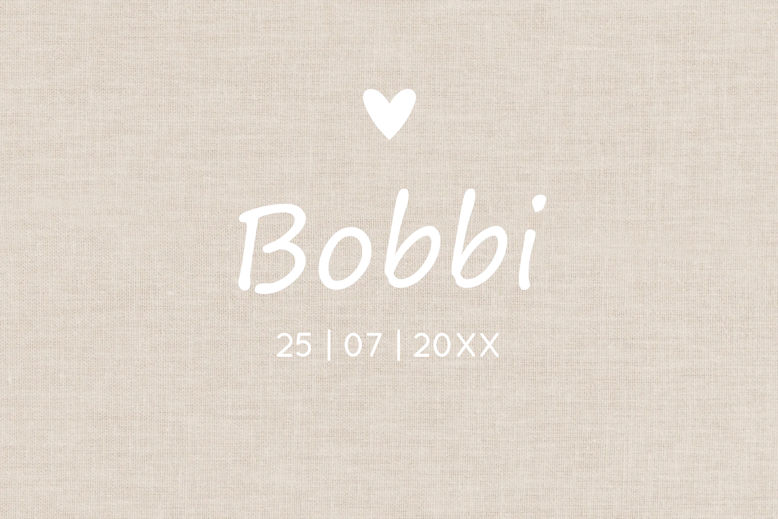 Minimalistisch geboortekaartje beige, crème wit met linnen look, hartje en naam in goudfolie.
