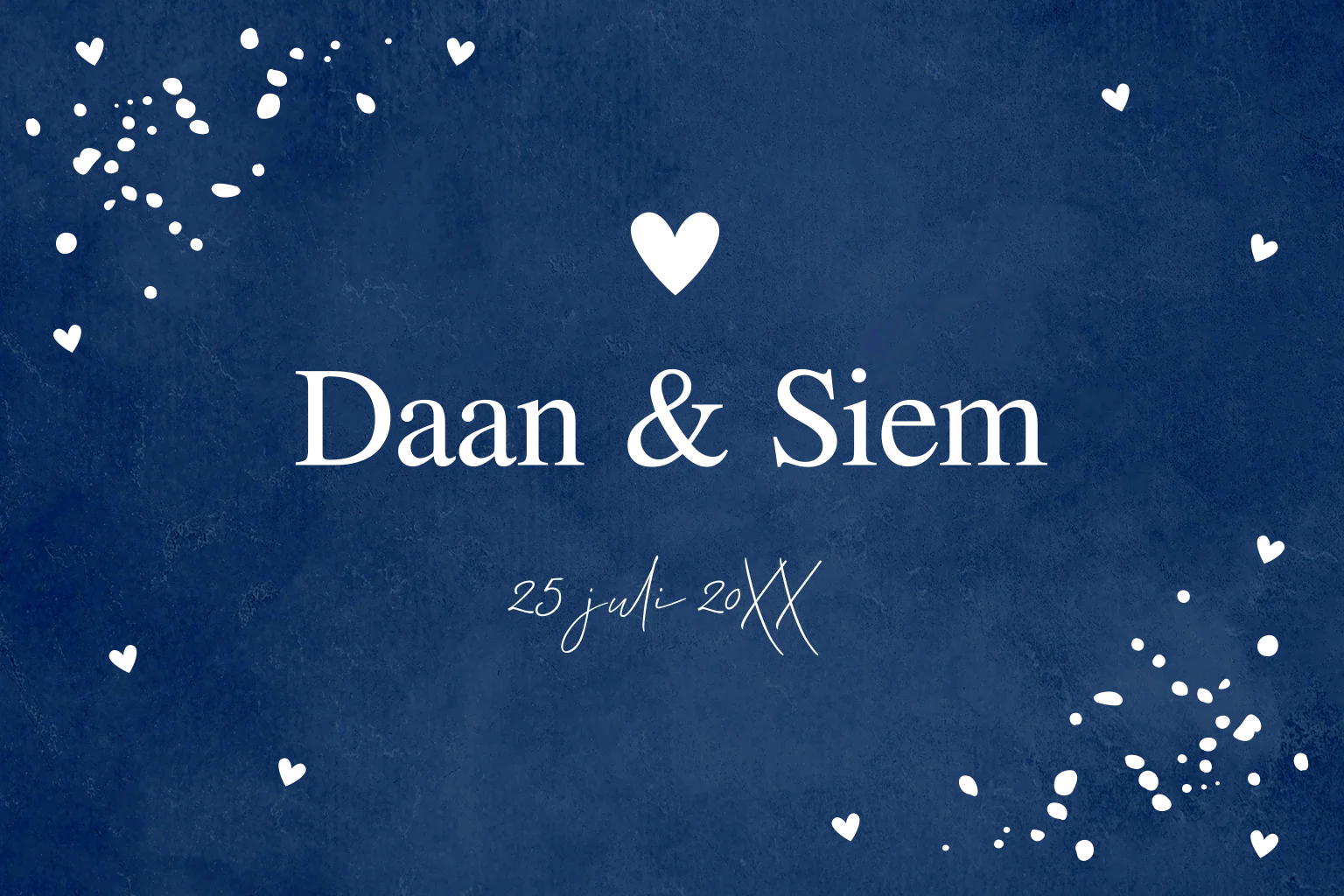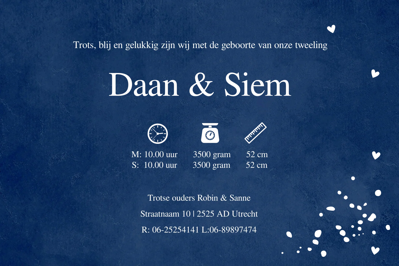 Geboortekaartje voor een tweeling jongens donkerblauw met goudfolie hartjes.