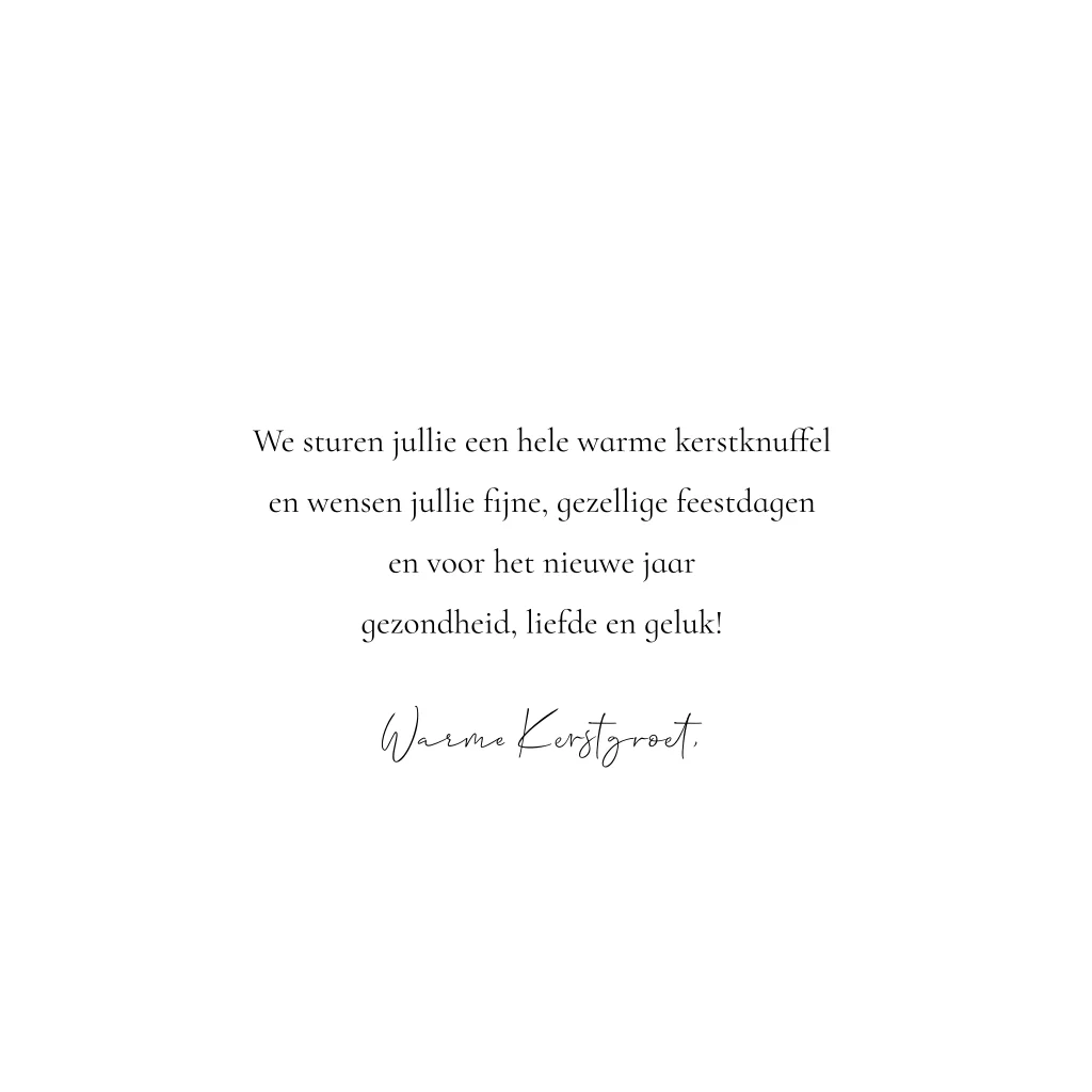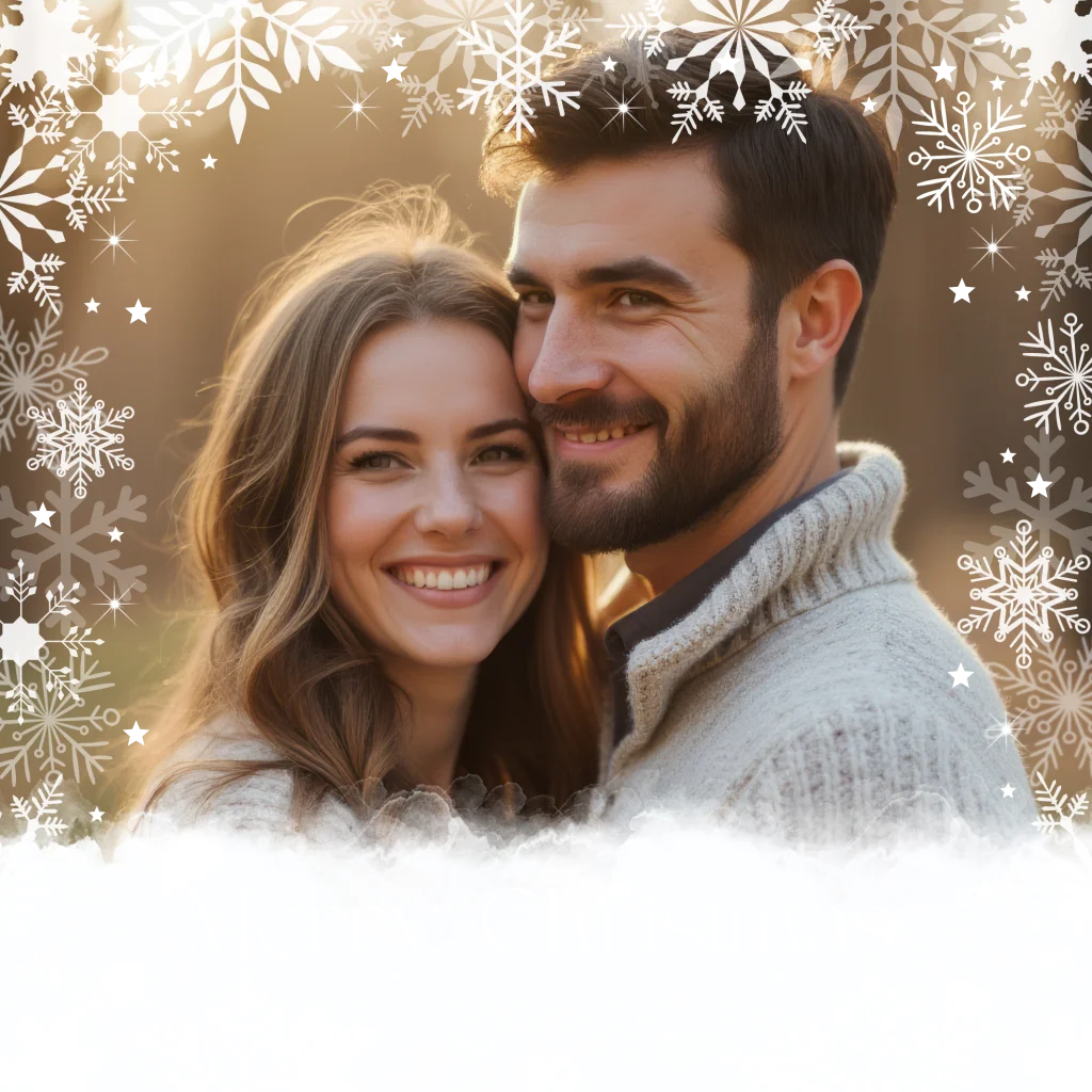 Kerstkaart met foto, sneeuwvlokken kader en goudfolie.