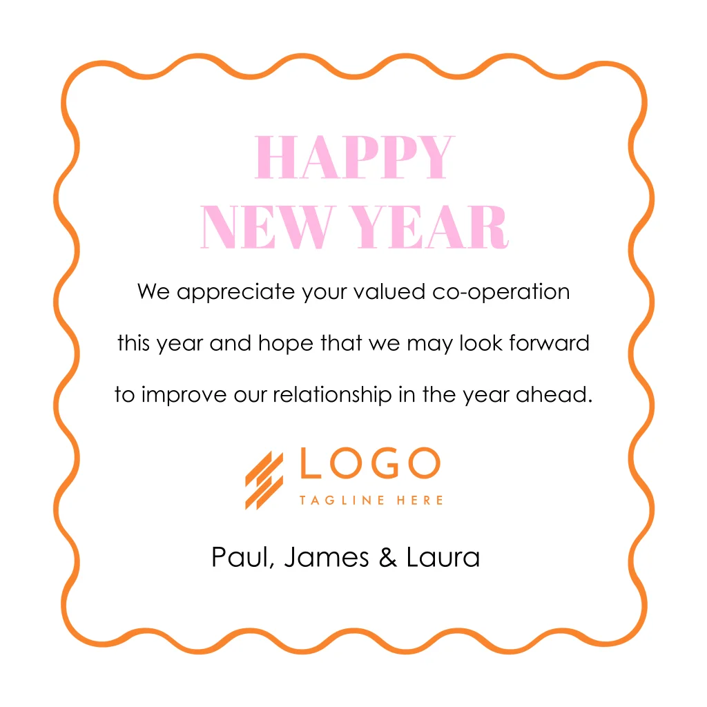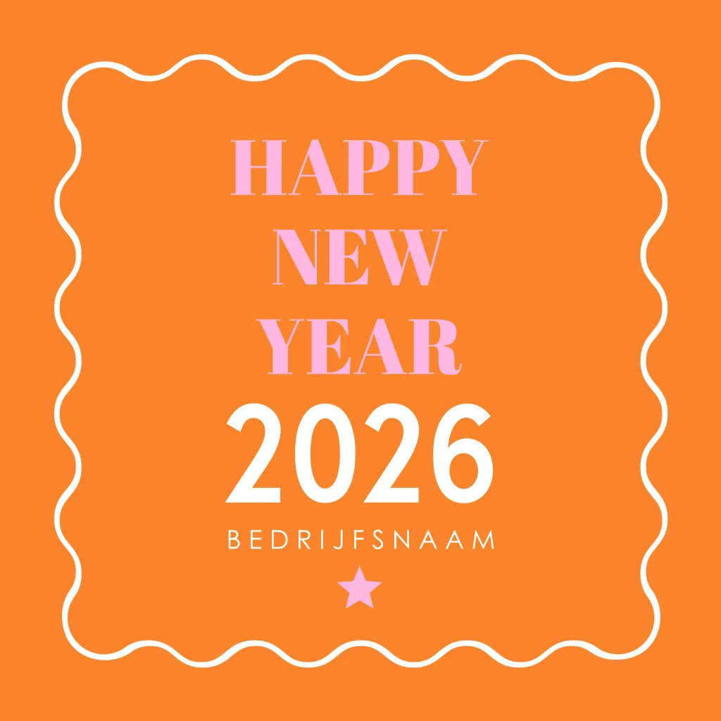 Zakelijke Nieuwjaarskaart oranje 2026 met moderne typografie roze. Pas de kleuren naar wens aan.