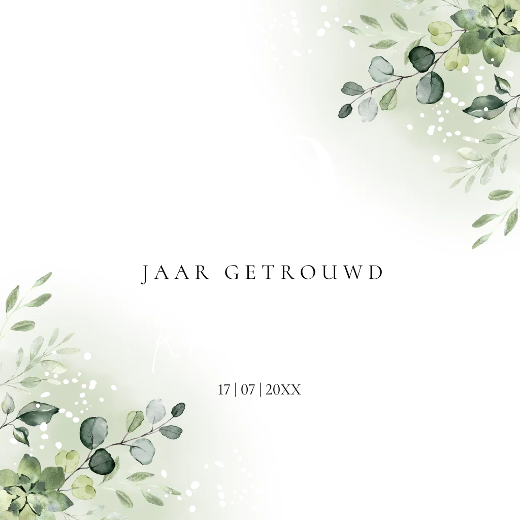 Uitnodiging huwelijk jubileum kaart groen met watercolour blaadjes, tekst 50 jaar getrouwd en goudfolie. Pas het jaartal naar wens aan!