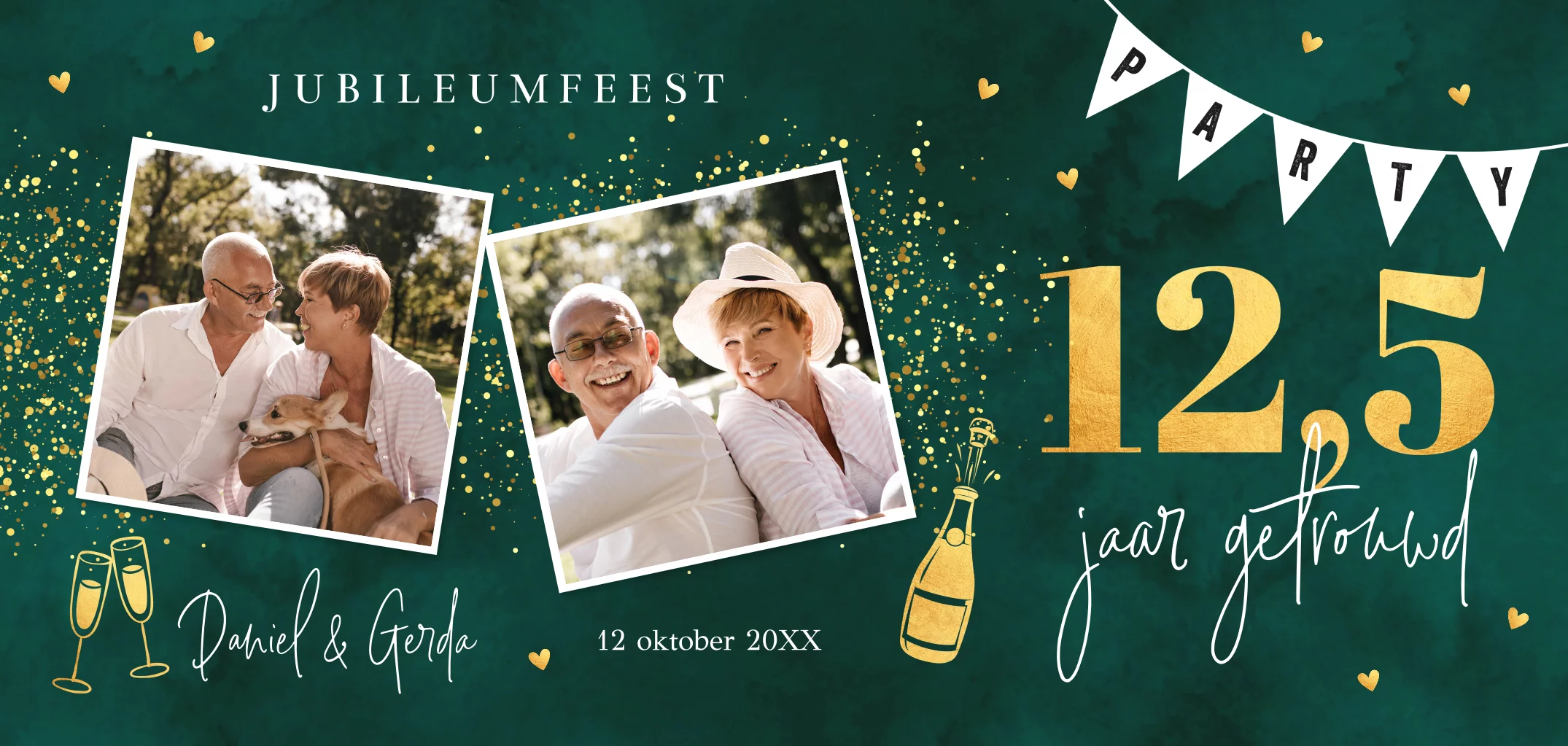 Jubileumkaart uitnodiging 12,5 jaar getrouwd groen panorama met fotocollage en goudlook.