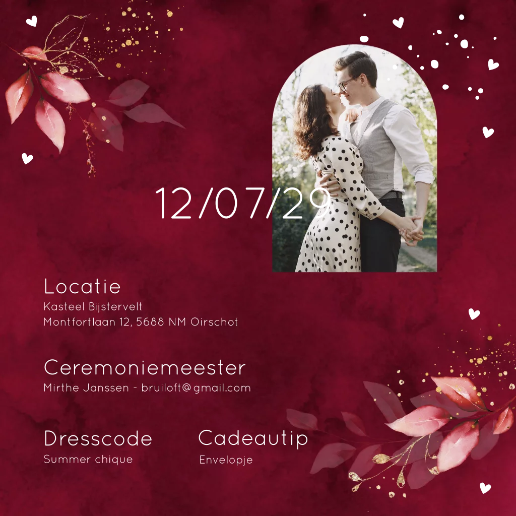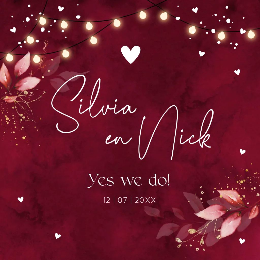 Stijlvolle trouwkaart rood met botanische bladeren, lampjes en goudfolie. In de binnenkant staan leuke trouw symbolen en is ruimte voor een eigen foto.