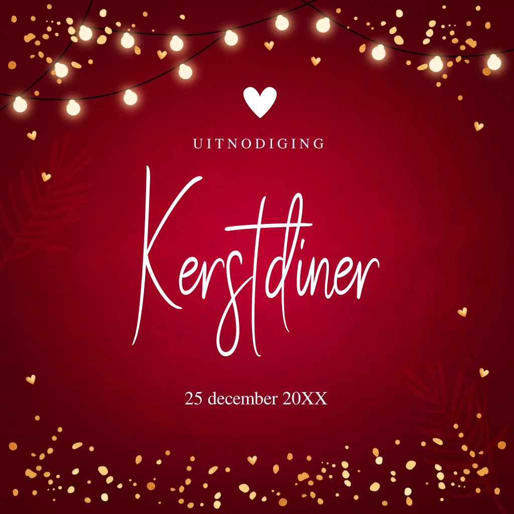 Sfeervolle kerstdiner uitnodiging rood spetters, lampjes en goudfolie. Nodig familie, vrienden of collega's uit voor een gezellig kerstdiner met deze mooie uitnodiging.