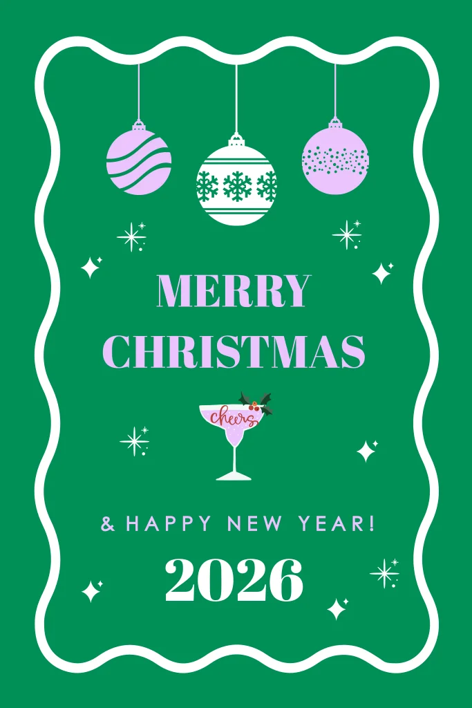 Hippe kerstkaart groen paars met kerstballen en golvend kader. Pas de kleuren naar wens aan!