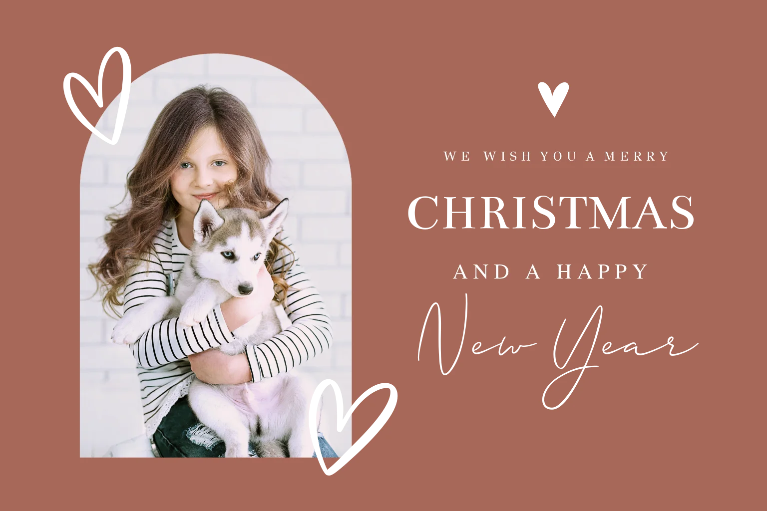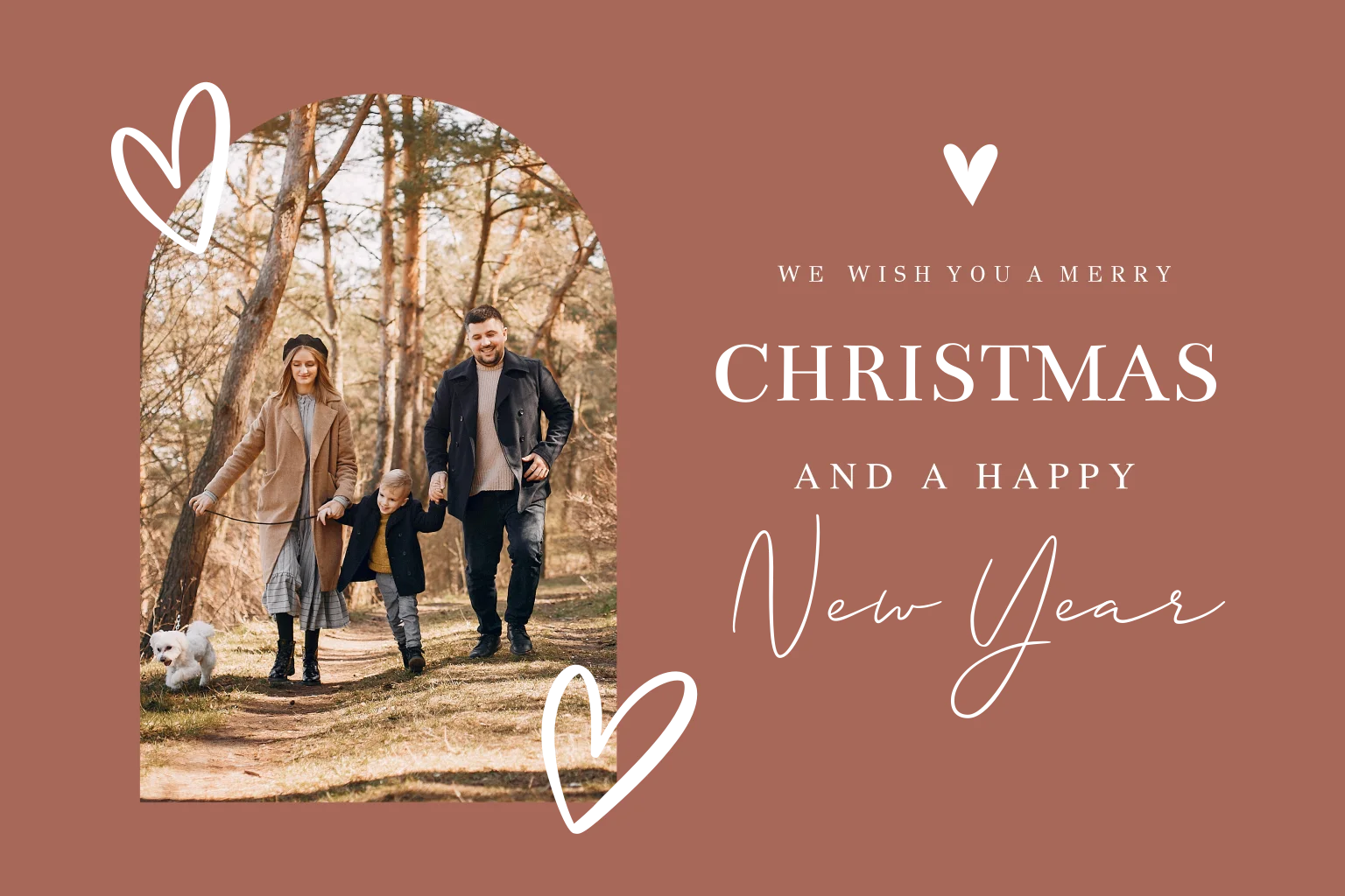 Stijlvolle luxe kerstkaart terracotta roze met foto in boog vorm, hartjes en goudfolie.