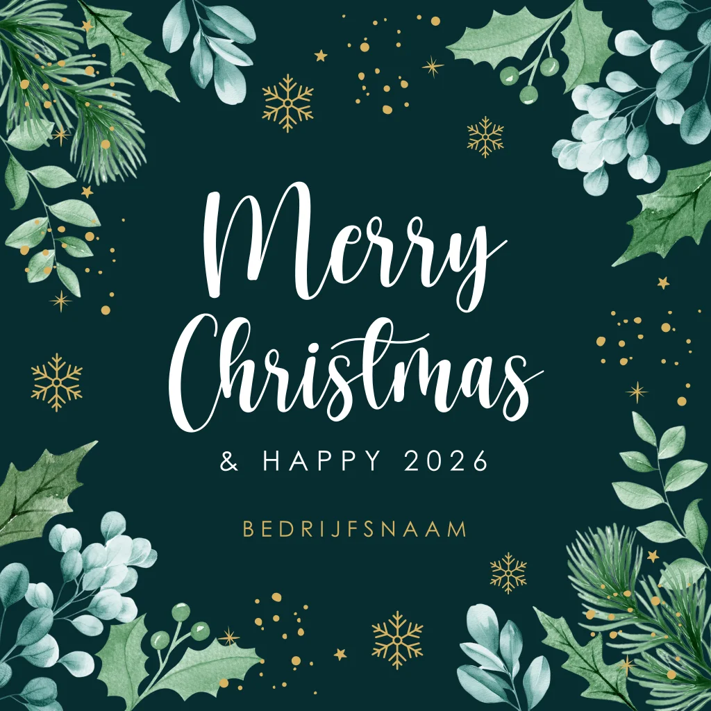 Zakelijke kerstkaart groen met kersttakjes, bladeren en sneeuwvlokken.