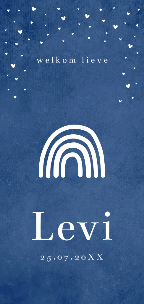 Geboortekaartje voor een jongen langwerpig blauw met regenboogje en goudfolie.