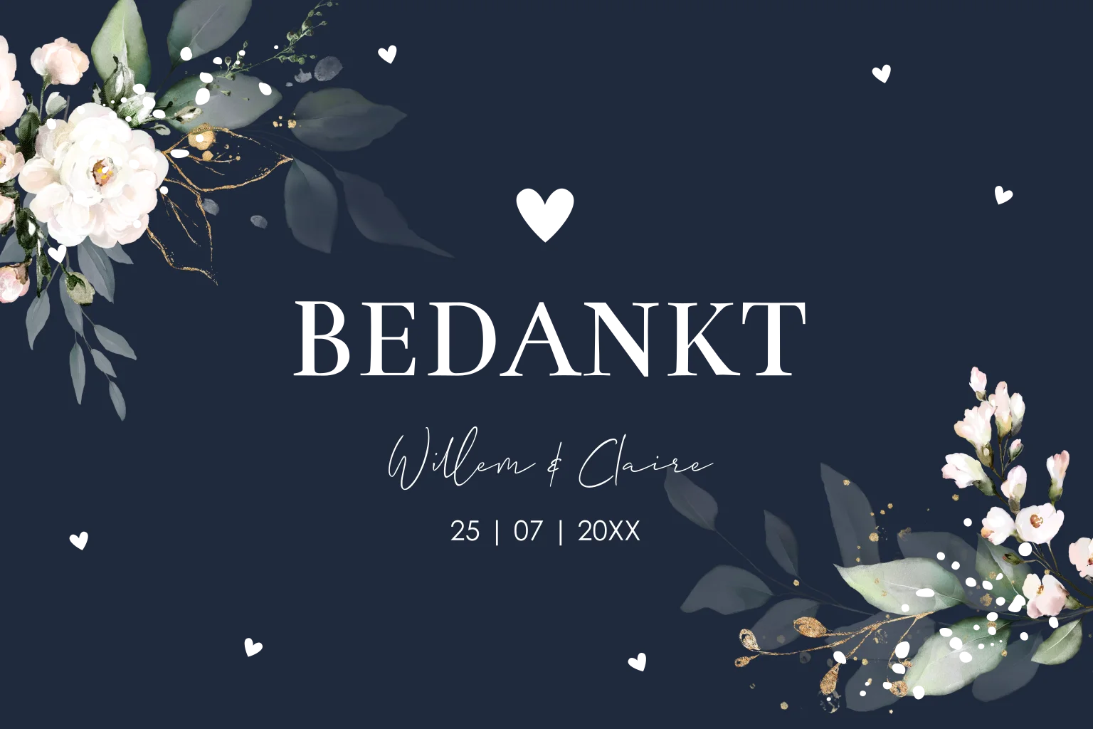 Bedankkaart huwelijk bloemen, blauwe achtergrond en foliedruk.
