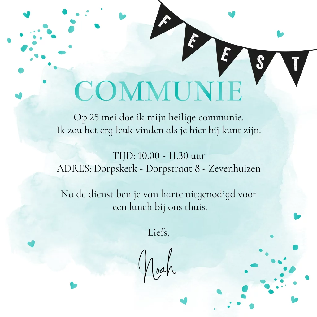 Communie uitnodiging voor een jongen met foto, waterverf, slinger en hoogglans petrol.
