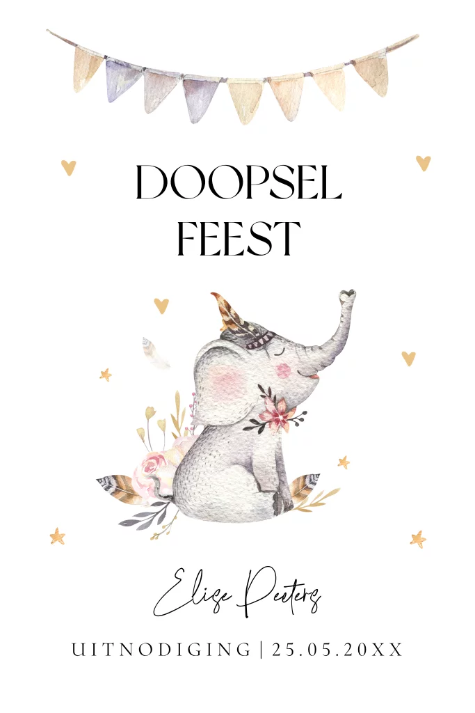 Doop uitnodiging voor een meisje met olifantje en slinger.