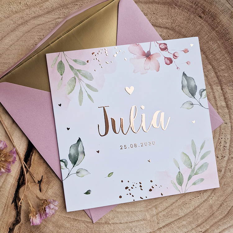 Geboortekaartje voor een meisje met waterverf bloemen en groene bladeren. Kies voor dit mooie botanische geboortekaartje met foliedruk.