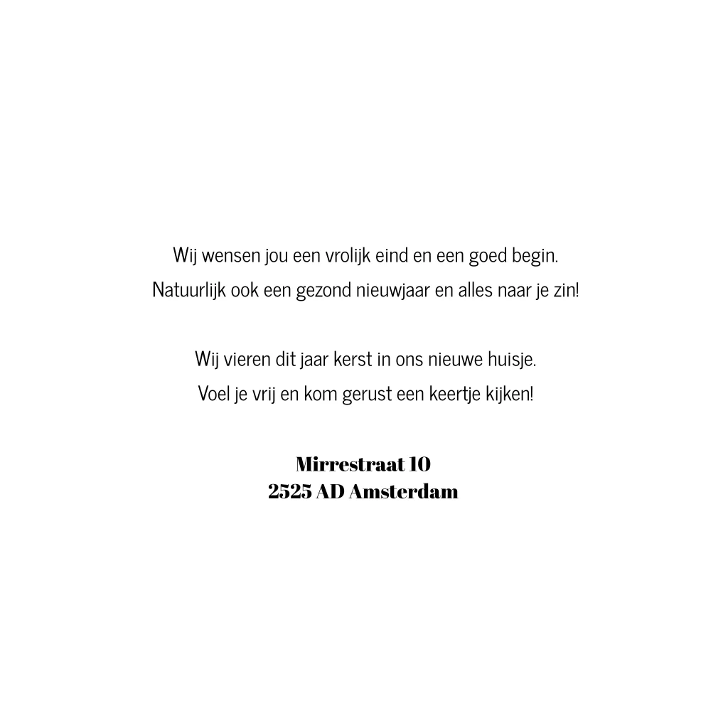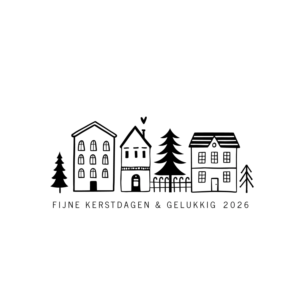 Moderne kerst verhuiskaart wit met zwart getekende huisjes en goudfolie. Combineer kerst en verhuiskaart in 1 kaart en stuur familie, vrienden of collega's deze leuke kerstverhuiskaart!
