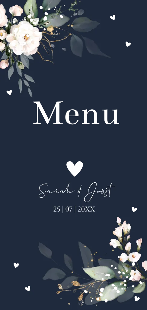 Menukaart bruiloft donkerblauw witte bloemen goudfolie
