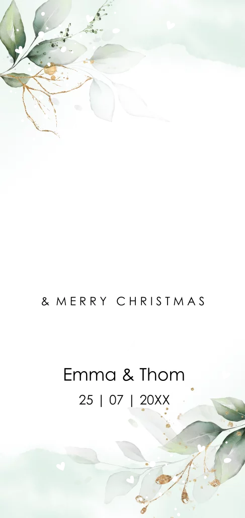 Save the Date kerstkaart botanisch groen wit blaadjes goudfolie