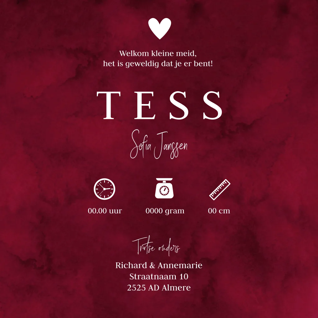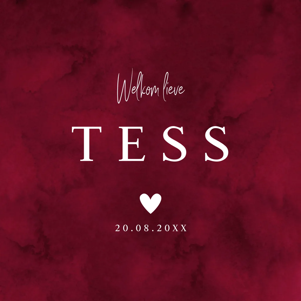 Geboortekaartje minimalistisch voor een meisje bordeauxrood met naam en hartje in goudfolie.