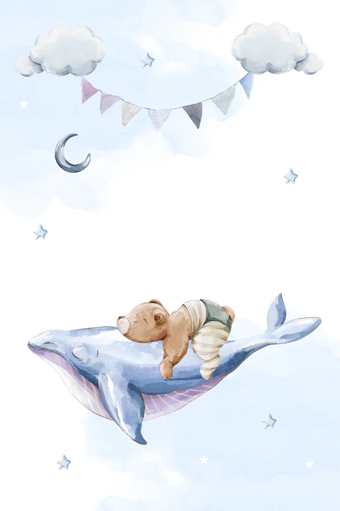 Geboortekaartje blauw voor een jongen met walvis, beertje, wolkjes, sterren en goudfolie.